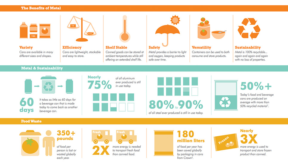 Metal, to an extent unmatched by any other packaging format keeps food fresh and safe for an extended period of time. Data from North America has extrapolated that metal packaging can globally save over a billion liters of food per year than if that same produce was packaged in alternative formats. Furthermore, foods in metal packaging are made safe for consumption over time through the retorting process. As a result, canned goods have an unrivaled food safety record.
