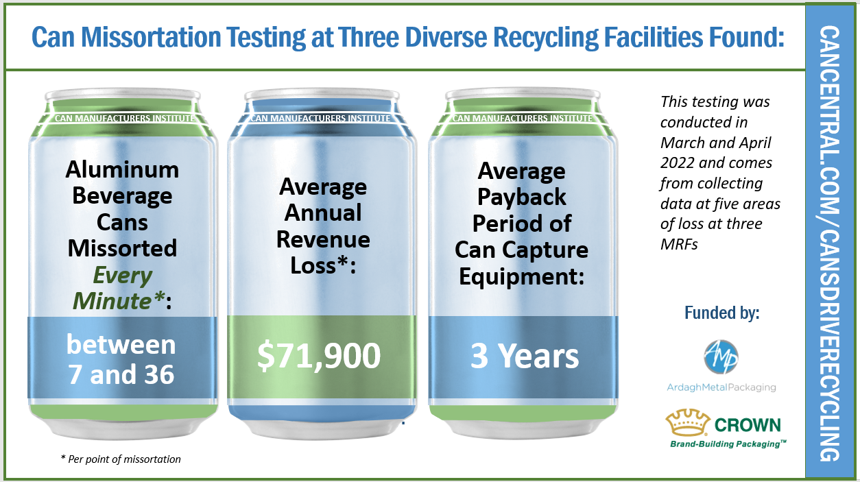 An infographic titled "Can Missortation Testing at Three Diverse Recycling Facilities Found:" with three large aluminum cans below the title. The first can, labeled "Can Manufacturers Institute" reads, "Aluminum Beverage Cans Missorted Every Minute: Between 7 and 36, per point of missortation." The second can, labeled "Can Manufactureres Institute" reads, "Average Annual Revenue Loss: $71,900, per point of missortation." The third can, labeled "Can Manufactures Institute" reads, "Average Payback Period of Can Capture Equipment: 3 Years." Text to the right of the cans clarifies that, "This testing was conducted in March and April 2022 and comes from collecting data at five areas of loss at three MRFs." Below this text are the logos for Ardagh Metal Packaging and Crown Cork and Seal, with the text "Funded by." A URL on the right-hand side of the infographic points viewers to visit cancentral.com/cansdriverecycling.